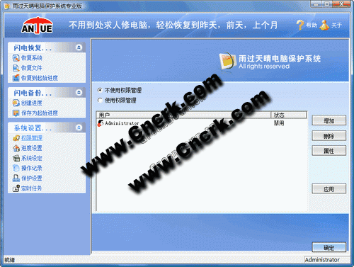 恢復(fù)系統(tǒng)是雨過天晴專業(yè)版最重要的功能,在電腦出現(xiàn)故障時(shí),如出現(xiàn)系統(tǒng)錯(cuò)誤、文件損壞、上網(wǎng)時(shí)安裝了垃圾軟件、廣告程序、試用了一個(gè)軟件卻怎么也卸載不掉等軟件故障時(shí),就可以使用恢復(fù)系統(tǒng)功能,將系統(tǒng)恢復(fù)到之前的進(jìn)度狀態(tài),從而清除這些系統(tǒng)故障。