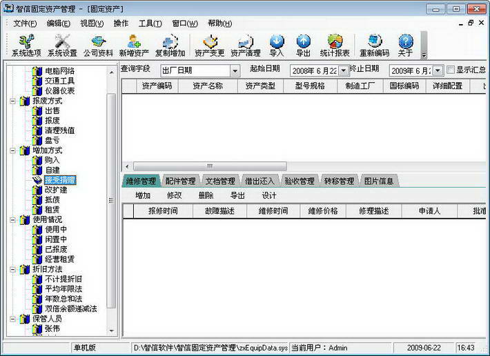 智信固定資產(chǎn)管理系統(tǒng)是一款優(yōu)秀的固定資產(chǎn)管理軟件,主要應(yīng)用于企業(yè)、機(jī)關(guān)、學(xué)校、事業(yè)等單位的固定資產(chǎn)管理,軟件支持多種折舊方法(即平均年限法、年數(shù)總和法、雙倍余額遞減法及工作量法),可以分別為固定資產(chǎn)選擇最佳折舊法,以正確計算產(chǎn)品成本和當(dāng)期損益,能有效加強(qiáng)固定資管理,避免資產(chǎn)的流失,具有良好的輔助作用。智信固定資產(chǎn)管理系統(tǒng)可廣泛適用于電子、電器、醫(yī)藥、服裝、建筑、物資、化工、商貿(mào)、超市、旅游、機(jī)械、建材、科技、通訊等各類企業(yè)公司,及機(jī)關(guān)、事業(yè)單位、學(xué)校、研究所等機(jī)關(guān)事業(yè)型單位。【軟件特點】