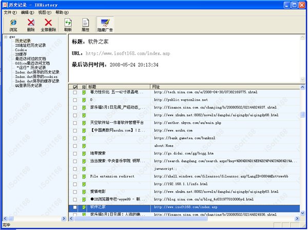 歷史記錄管理器用于查看和管理IE上網(wǎng)歷史記錄、緩存記錄、cookie記錄、地址欄歷史記錄、運(yùn)行歷史記錄、最近訪(fǎng)問(wèn)過(guò)的文件、QQ歷史記錄,以及使用IE不能查看和管理的保存在index.dat文件中的歷史記錄等等。它不但可以方便直觀的查看和管理本機(jī)與上網(wǎng)有關(guān)的所有歷史記錄,而且可以查看和管理用戶(hù)對(duì)本機(jī)的所有文件操作記錄,同時(shí)還可以有選擇性的刪除或全部刪除歷史記錄。另外,還可以查看并徹底清除使用IE的清除歷史記錄不能清除的記錄。最大限度保護(hù)你的隱私。也可以用于監(jiān)控未成年人對(duì)電腦的使用