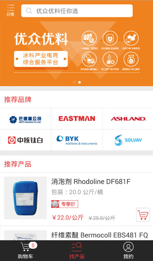 優(yōu)眾優(yōu)料是“聯(lián)眾涂料網(wǎng)”開發(fā)的一款針對涂料企業(yè)提供原材料專業(yè)采購的軟件。優(yōu)眾優(yōu)料通過自營型電商綜合服務(wù)模式,讓您能夠“買得真、買得對、買得快、買得省”。
