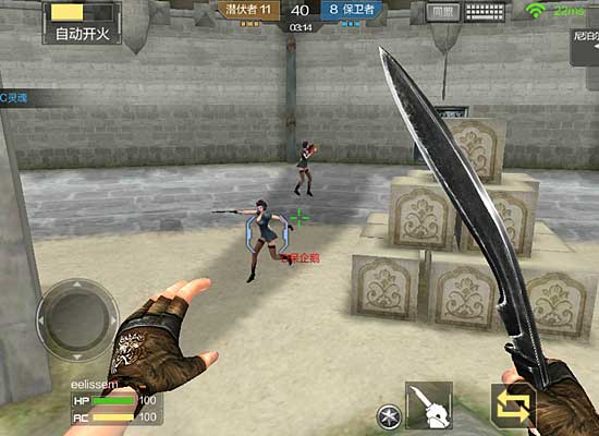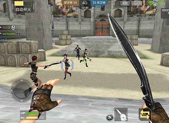 另一種二對一的打法,是采取偷襲的方式,多用于隊友缺乏良好的武器,只能用小刀發(fā)動進(jìn)攻的時候。手持威力較大武器的我們,不需要第一時間出現(xiàn)在戰(zhàn)場,可以仔細(xì)觀察隊友與敵人的走位動向,抓準(zhǔn)時機(jī)從對手身后快速接近,一刀致命。一般來說,敵人與我方隊友纏斗時都會有一定量的損血,所以我們在切近敵人后直接揮舞輕刀,一般情況下即可完成擊殺。
