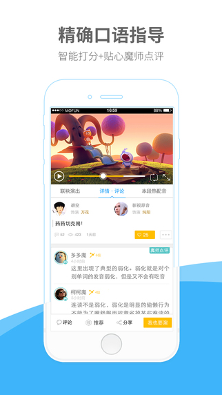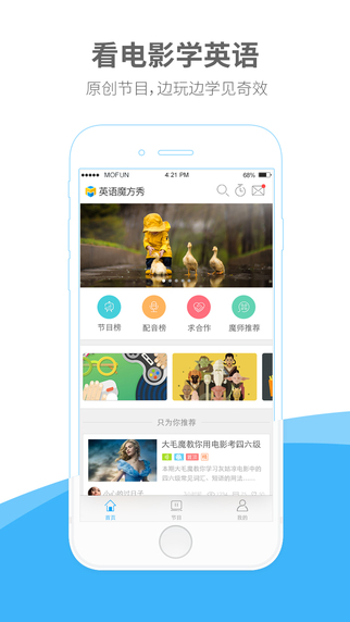 每個(gè)魔友都將擁有自己配音的視頻大片,還能分享到朋友圈盡情炫耀!從此告別“開(kāi)口就緊張、發(fā)音總蹩腳”的境地,讓你徹底愛(ài)上說(shuō)英語(yǔ)!