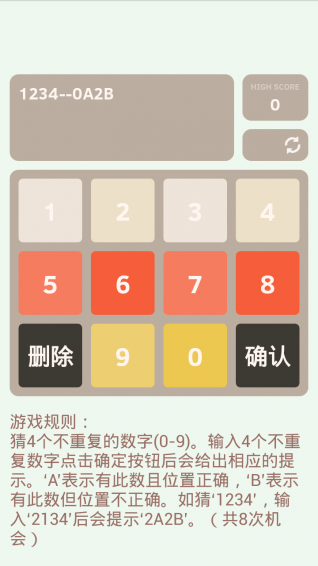 “趣味猜數(shù)字”是一款趣味的小游戲,畫面簡潔,玩法簡單。此游戲操作方便,通過觸摸、滑動(dòng)兩種操作即可游戲,即開即玩,擁有超高的用戶體驗(yàn),在游戲過程中體驗(yàn)前所未有的樂趣。游戲規(guī)則:您每猜一個(gè)數(shù)字,游戲就要根據(jù)這個(gè)數(shù)字給出幾幾,其中前面的數(shù)字表示位置正確的數(shù)的個(gè)數(shù),而前的數(shù)字表示數(shù)字正確而位置不對的數(shù)的個(gè)數(shù)。最終在8次之內(nèi)猜出數(shù)字即可獲勝。