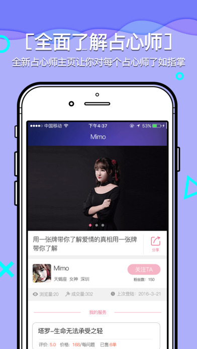 專業(yè)的情感咨詢最資深的心靈規(guī)劃師為你傾心服務(wù),最專業(yè)的情感咨詢只在占心!借助塔羅的魅力,撥云見日,助你擺脫心靈困境。免費區(qū)與付費區(qū)同時開放,愛情、事業(yè)、桃花、還有深埋的心事兒,都交給占心吧。