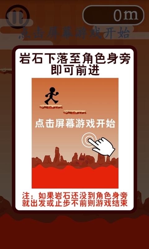 《焰獄階梯》是一款極具反應(yīng)力的游戲,稍不留神就有可能掉入滾滾巖漿當(dāng)中。玩家需懷著忐忑的心慢慢前進(jìn)的哦。 玩法其實(shí)很簡單,當(dāng)巖石下落到你腳下的時候,瞬間點(diǎn)擊屏幕確定下巖石的位置,然后前進(jìn)。游戲中切要注意如果巖石還沒到你身旁你就出發(fā)或是一直不前進(jìn),你也是會歇菜的哦。所以找準(zhǔn)時機(jī)很重要哦。 大家準(zhǔn)備好了嗎?一起開始我們的大冒險吧~
