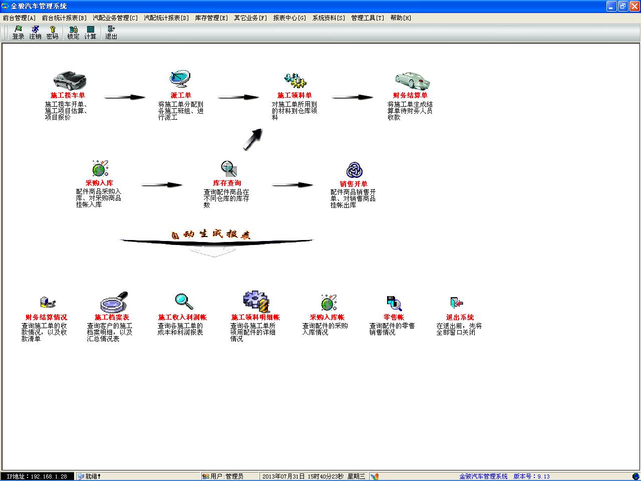金駿汽車管理系統(tǒng)是一款非常專業(yè)的汽車管理軟件。本軟件的功能非常強大,操作非常簡單。軟件包含了前臺管理、前臺統(tǒng)計報表、汽配業(yè)務管理、汽配統(tǒng)計報表、庫存管理等功能模塊,為汽車行業(yè)管理者的管理帶來了極大的方便。【軟件特點】