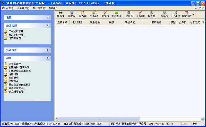 新峰送貨單助理(新峰送貨單軟件) 適用于小型企業(yè)或個(gè)人及個(gè)體戶用于送貨單管理.本軟件集送貨單,產(chǎn)品名稱/產(chǎn)品單價(jià)/規(guī)格管理,月結(jié)管理,數(shù)據(jù)分析,圖表分析于一身.具用自動(dòng)記憶功能,你開過的送貨單不需要重復(fù)錄入,你送過貨的客戶不需要鍵入,真正的方便實(shí)用.充分利用數(shù)據(jù)庫功能給工作帶來的便利.配合五級(jí)權(quán)限,從此告別手寫送貨單和EXCEL做月結(jié)的煩惱.