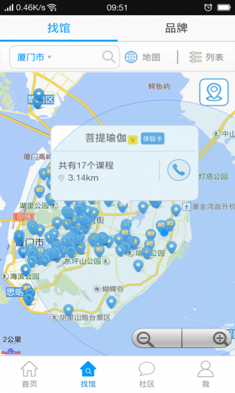 4、瑜伽場館:數據覆蓋全國,自動定位附近場館,查看場館信息和瑜伽課程,長按地圖任意一點,即可查詢該點附近的場館。