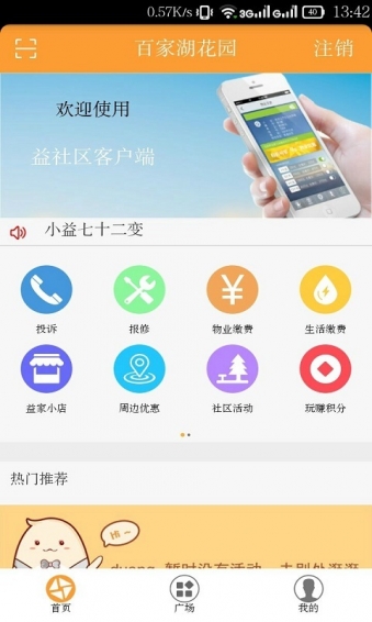 益社區(qū)包含以下功能模塊:小區(qū)通知、生活服務(wù)、團(tuán)購秒殺、物業(yè)繳費(fèi)、停車?yán)U費(fèi)、投訴報(bào)修、社區(qū)活動(dòng)、周邊優(yōu)惠等。業(yè)主下載益社區(qū)APP即可注冊成為會(huì)員,業(yè)主投訴后會(huì)獲得積分獎(jiǎng)勵(lì),積分可用于平臺(tái)消費(fèi)(充抵物業(yè)費(fèi)、停車費(fèi)、購物消費(fèi)等)。【更新日志】