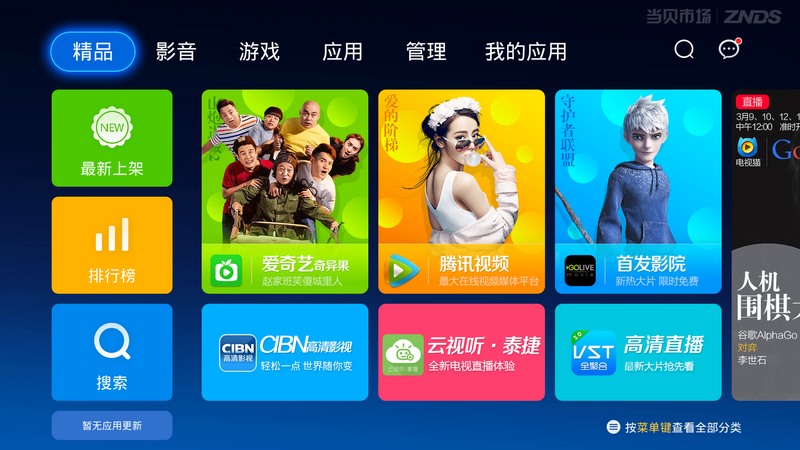 當(dāng)貝市場(chǎng)是一款專為智能電視和安卓電視盒 量身打造設(shè)計(jì)的應(yīng)用市場(chǎng)!海量精選TV應(yīng)用,遙控器輕松操作,界面簡(jiǎn)潔易用,管理得心應(yīng)手!當(dāng)貝市場(chǎng)TV版收錄了近千款應(yīng)用和游戲,全部都是電視專屬版應(yīng)用。應(yīng)用不在多而在精。每一款應(yīng)用都是我們精選的,每一款應(yīng)用相信也都是你想要的。