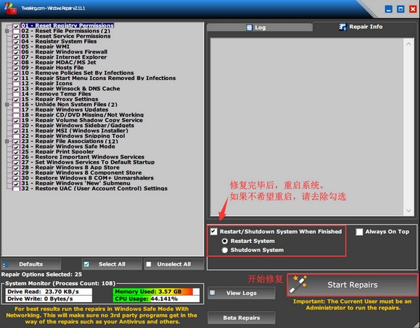 2. 左欄為會進行修復的選項,如果你不了解,請使用默認即可。默認勾選了修復完畢后重啟系統(tǒng)的選項,如果你不需要重啟,請去除。