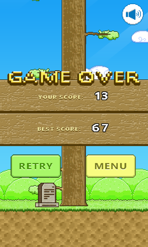 操作說明:開始游戲后,點擊屏幕左右砍樹,注意不要碰到樹枝,碰到樹枝則死亡,游戲上方血條結(jié)束則游戲失敗。