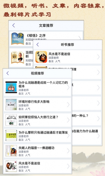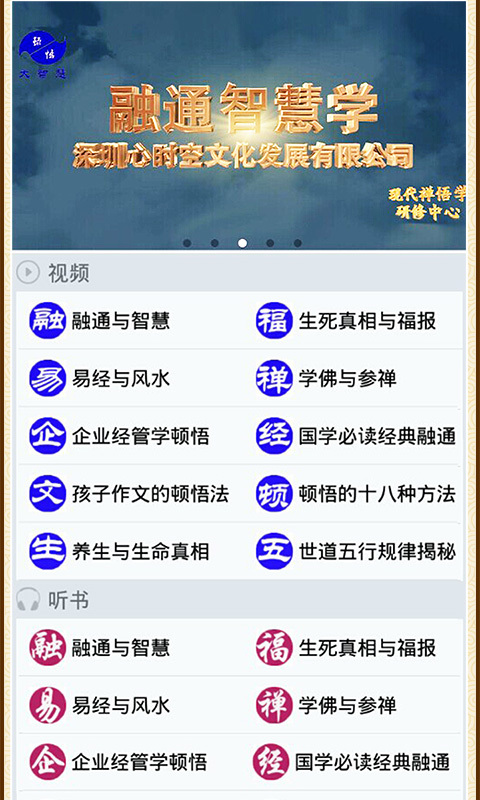 融通智慧學(xué)APP是以最利于碎片時(shí)間學(xué)習(xí)的微內(nèi)容,以最利于高效領(lǐng)悟的頓悟之學(xué)為平臺模式,直接為學(xué)人解疑生命最核心問題、事業(yè)最關(guān)鍵問題,主要欄目有微視頻(問題答疑)、微音頻(精品聽書)、精選文章、頓悟大講堂(定期講學(xué))、名仕大家(各領(lǐng)域精英人物介紹)。融通智慧學(xué)APP設(shè)計(jì)的“功過格”欄目功能特別針對學(xué)人每日功德和過失進(jìn)行記錄統(tǒng)計(jì),將成為學(xué)人日常價(jià)值觀修煉、累積福德、知命轉(zhuǎn)運(yùn)的最得力工具。