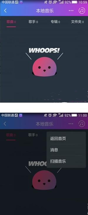 2.進入后顯示的一首歌也沒有,大家點擊右上角音樂符號旁邊的“…”彈出一個提示框,里面有選項掃描音樂,點擊掃描本地音樂