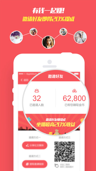 2,邀請(qǐng)好友,即可賺取20%的提成。新版賺點(diǎn)新增邀請(qǐng)好友功能,可以通過(guò)掃碼,復(fù)制鏈接以及分享的方式