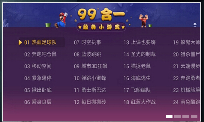 《電視游戲99合1》囊括了市面上所有的TV游戲,遙控器完美適配。一起拿起遙控器找回童年回憶吧。電視游戲99合1TV版內(nèi)容非常的豐富,數(shù)十款經(jīng)典的電視小游戲都各具特色,讓玩家們能夠選擇自己喜愛的類型來玩耍