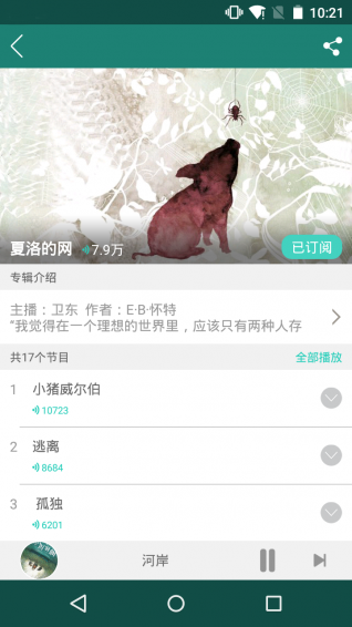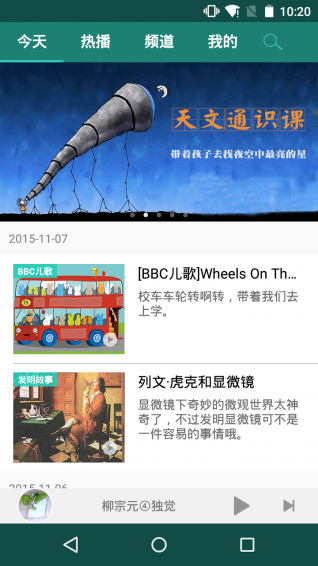 【今天】每天更新最新節(jié)目,還可以查看往期的節(jié)目歷史記錄。類似雜志的更新方式,讓每天都有新的感覺。【熱播】這里有最火爆,點(diǎn)擊量排名最高的專輯節(jié)目,比如足球枕頭們、胖叔叔帶你去旅行,土豆爸爸的時(shí)光機(jī)等等,不知道聽什么的時(shí)候選這個(gè)絕不后悔。