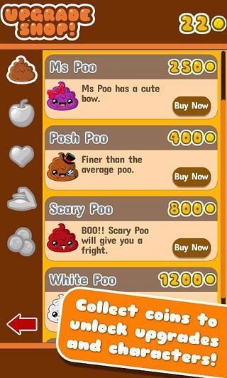 1.進入游戲后點擊屏幕任意角落開始游戲。2.利用重力感應控制大便往下跑。