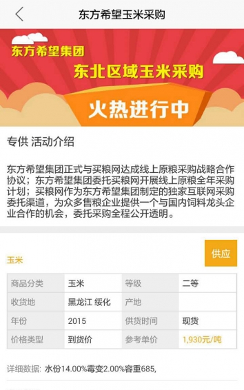 1.用戶可以簡(jiǎn)單便捷的發(fā)布原糧的庫(kù)存量及出售價(jià)格,即時(shí)展示在買糧網(wǎng)應(yīng)用上;2.用戶可以發(fā)布原糧的采購(gòu)需求,由專業(yè)的交易人員提供匹配推薦;