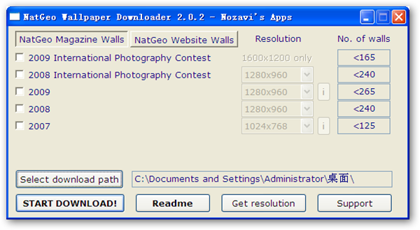 當(dāng)前版本 NatGeo Wallpaper Downloader 2.02,新版增加了國(guó)家地理雜志網(wǎng)站壁紙下載功能,解壓后運(yùn)行主程序 ngdl.exe,然后選擇年份和分辨率即可一鍵下載國(guó)家地理雜志壁紙了, 國(guó)家地理雜志壁紙,分辨率可選800×600、1024×768、1280×960、1600×1200;國(guó)家地理雜志已經(jīng)成為世界上最廣為人知的一本雜志,NatGeo Wallpaper Downloader 是一款免費(fèi)軟件,可以打包下載國(guó)家地理雜志的精美壁紙,