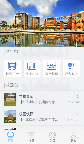 “華南理工”APP 2.0版本,是華南理工大學(xué)于2015年重新上線的校園移動門戶APP,新版本的APP啟用了新的系統(tǒng)平臺,在原有的功能基礎(chǔ)上增加了消息推送、討論圈子等功能。就業(yè)在線已經(jīng)率先入住APP為同學(xué)們提供第一手的招聘就業(yè)咨詢。