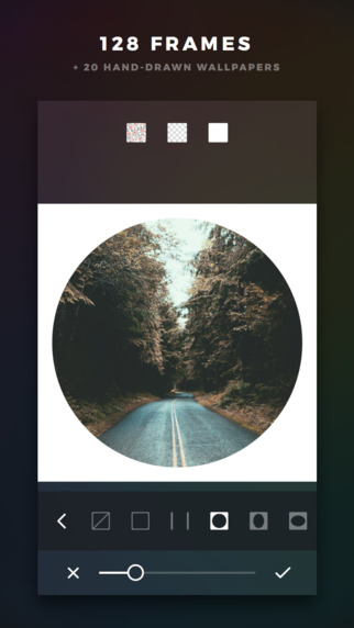邊框也是一大特色,選擇很多,為了適配直接發(fā)送Instagram,形狀、字母類的會強(qiáng)制圖片1:1,邊框可調(diào)大小、顏色、透明度,甚至可以加上15種背景圖,很漂亮。