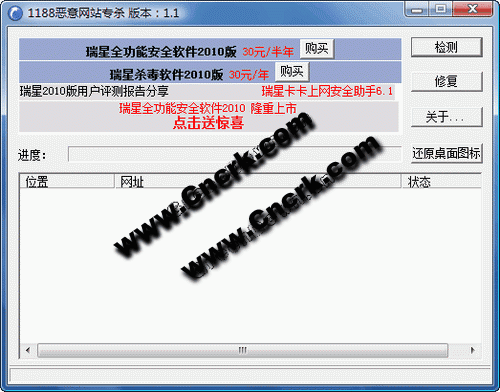 瑞星惡意網(wǎng)站專殺工具 V1.1.0.2 簡體中文綠色免費(fèi)版 近來一種劫持 IE 瀏覽器的病毒流行,該病毒會在桌面上建立多個假 IE 瀏覽器快捷方式,當(dāng)用戶點(diǎn)擊后,會自動訪問 1188.com 惡意網(wǎng)站,并對用戶的電腦安全構(gòu)成威脅、造成進(jìn)一步的破壞。除了 1188.com 之外,該病毒還會修改成多個其它惡意網(wǎng)站。