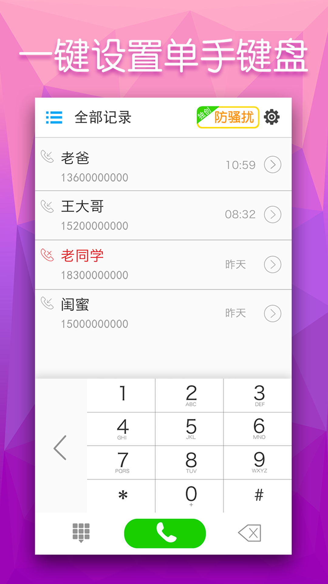 多多電話是一款專注于為用戶提供優(yōu)質(zhì)撥號(hào)體驗(yàn)的撥號(hào)軟件,其撥號(hào)鍵盤(pán)智能檢索功能給用戶帶來(lái)了高效的極速撥號(hào)體驗(yàn),用戶可根據(jù)聯(lián)系人名字的全拼,簡(jiǎn)拼,電話號(hào)碼片段檢索通訊錄,且通話記錄下拉即可查看常用聯(lián)系人,把用戶從繁瑣的系統(tǒng)撥號(hào)中解放出來(lái)!1、智能防騷擾,自定義“時(shí)間段”以及“城市”來(lái)屏蔽騷擾電話!