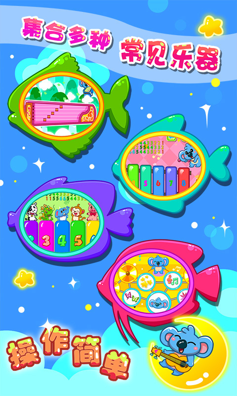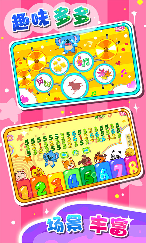 如今越來(lái)越多的家長(zhǎng)逐漸認(rèn)識(shí)到了音樂(lè)對(duì)孩子成長(zhǎng)的重要作用,想讓孩子能掌握一定的音樂(lè)技能,兒童寶寶學(xué)樂(lè)器集合了常見(jiàn)樂(lè)器分別是鋼琴,木琴,架子鼓,古箏。1、木琴:木琴聲音清脆悅耳,發(fā)揮你的音樂(lè)才華來(lái)為我們演奏一曲動(dòng)人歌曲吧。2、鋼琴:8個(gè)音符的任意組合,創(chuàng)造出快樂(lè)美妙的篇章。3、架子鼓:由五個(gè)鼓,兩面吊镲組成.點(diǎn)擊不同的鼓和镲,會(huì)有意外的驚喜哦!4、古箏:通過(guò)簡(jiǎn)單的5跟弦的組合彈奏出寧?kù)o悠揚(yáng)的韻律。