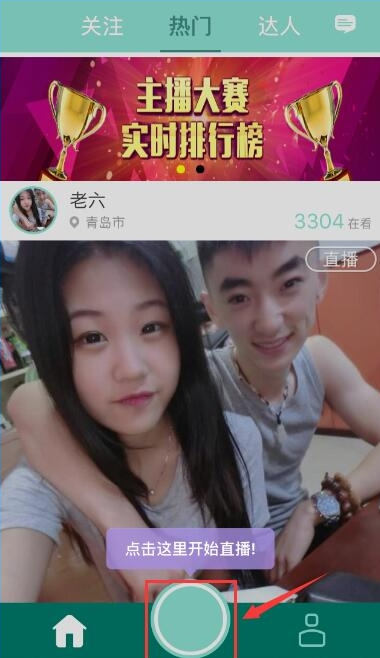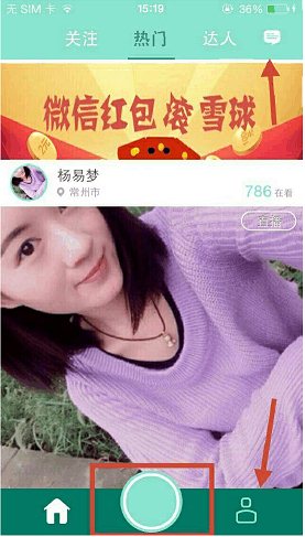 圖中紅色方框中的按鈕為開始直播按鈕。圖中右下角箭頭所指的是個人主頁,點擊跳轉(zhuǎn)至個人主頁界面。圖中右上角為私信按鈕,點擊可跳轉(zhuǎn)至私信界面。
