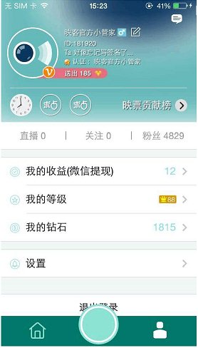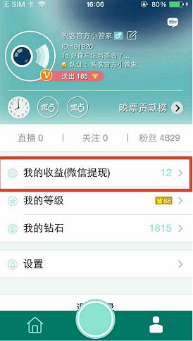 5、當我們賺到一定的映票后,用戶可以到我的個人頁面中,點擊我的收益;