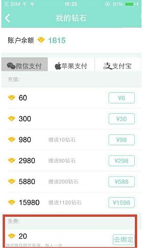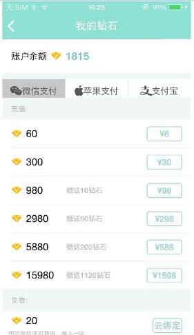 3、支付方式:微信支付、蘋果支付、支付寶支付。點擊相關(guān)數(shù)額可進行充值。