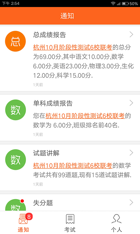 (1)管理方面:移動端學(xué)生和家長賬號由學(xué)生所在學(xué)校統(tǒng)一管理,統(tǒng)一組織考試,引導(dǎo)學(xué)生科學(xué)地規(guī)劃學(xué)習(xí)。(2)查詢方面:移動端提供消息提醒的方式推送每一次考試數(shù)據(jù)的更新,并且以可視化圖表形式(柱狀圖、條形圖、折線圖、雷達(dá)圖等)詳細(xì)清晰地展示各種指標(biāo)分析。