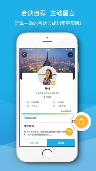 2.新增智能搜索和創(chuàng)業(yè)標(biāo)簽,用戶(hù)可以根據(jù)偏好搜索感興趣的合伙人.