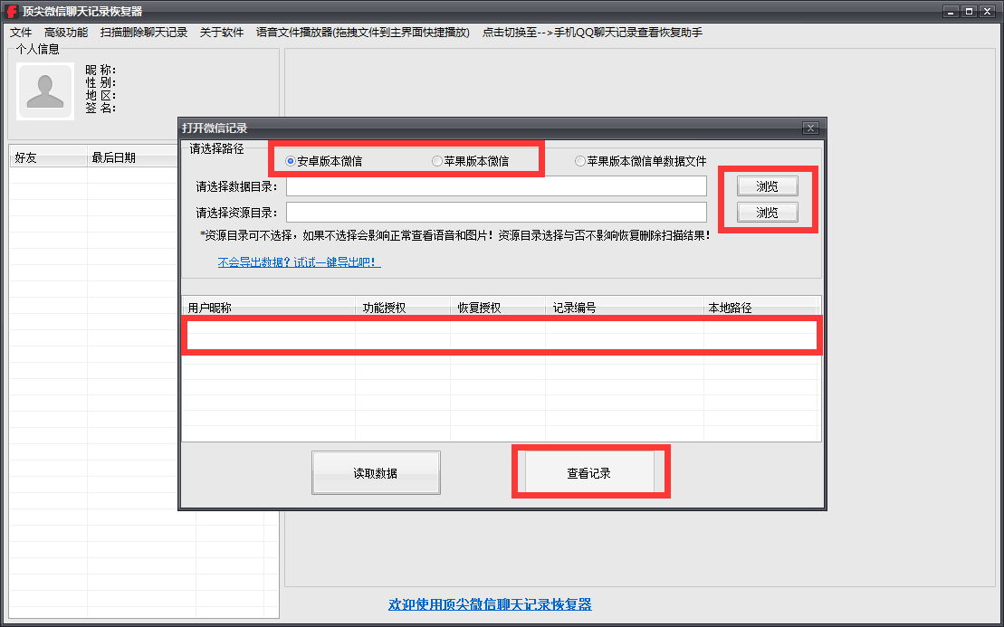 頂尖微信聊天記錄恢復(fù)器能夠解決微信的聊天記錄刪除了怎么恢復(fù)這一難題,是一款專門用來恢復(fù)微信聊天記錄丟失的軟件。軟件支持安卓以及蘋果版手機(jī)微信聊天記錄的恢復(fù),并且安卓設(shè)備無需進(jìn)行root,蘋果設(shè)備無需越獄就能夠?qū)崿F(xiàn)聊天記錄恢復(fù)。同時(shí)該軟件還支持手機(jī)QQ聊天記錄的查看與恢復(fù)。并能夠最大程度地掃描出每一條殘留的微信/QQ聊天記錄,通過智能解析、剔除亂碼,讓恢復(fù)更加優(yōu)質(zhì)化。