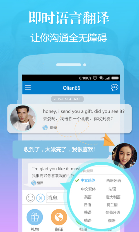 1)12種語言即時(shí)互譯:Perdateapp支持12種外語聊天即時(shí)翻譯,幫助用戶們實(shí)現(xiàn)聊天0距離,打造一個(gè)安全、暢通的聊天環(huán)境。