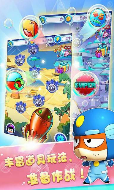 2014年開心超人官方指定游戲,國內(nèi)首創(chuàng)連線消除+角色扮演相結(jié)合的全新玩法, 多彩的泡泡球、數(shù)量眾多樂趣不同的關(guān)卡、搞笑的怪物,還有性格各異、能力超群的眾多超人,以及那些能力超群、與眾不同的超人機甲帶給每個玩家輕松快樂的游戲體驗。