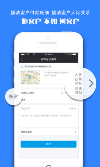 懸賞發(fā)布”尋找高手“請求別人,幫忙開發(fā)客戶以開發(fā)A企業(yè)為例,在A企業(yè)的地理位置處,發(fā)布尋找高手的任務(wù),并設(shè)置懸賞金額,請求其它用戶幫助,共享針對A企業(yè)的銷售經(jīng)驗,技能與人脈。對A企業(yè)有銷售經(jīng)驗的用戶就會收到推送,這些用戶也是A企業(yè)的其它產(chǎn)品與服務(wù)的供應(yīng)商。并在A企業(yè)處有過簽到。在接受了酬金后,即為您出謀劃策,精準(zhǔn)指引基于客戶地理位置找關(guān)系,銷售soeasy!想做哪家點哪家,SOEASY!BOSS再也不用擔(dān)心我的業(yè)績了。