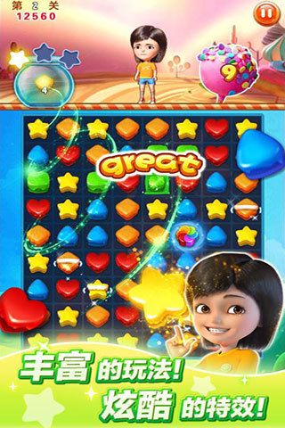 糖果世界大冒險HD是一款人氣火爆的三消游戲。擁有超過200個精心設(shè)計的關(guān)卡,以及4大關(guān)卡類型。掉落收集、指定消除、限時消除。20多個新奇有趣的障礙,給玩家?guī)砹瞬簧俚娜の逗腕@喜。10余種炫目的特效,配以悅耳音效,為玩家?guī)硪曈X和聽覺的雙重享受。