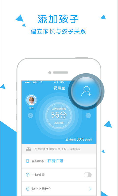 【此為愛熊寶孩子端,安裝在孩子手機上,需在家長手機上安裝家長端,用家長端掃描孩子端綁定,即可為孩子制訂上網(wǎng)計劃。