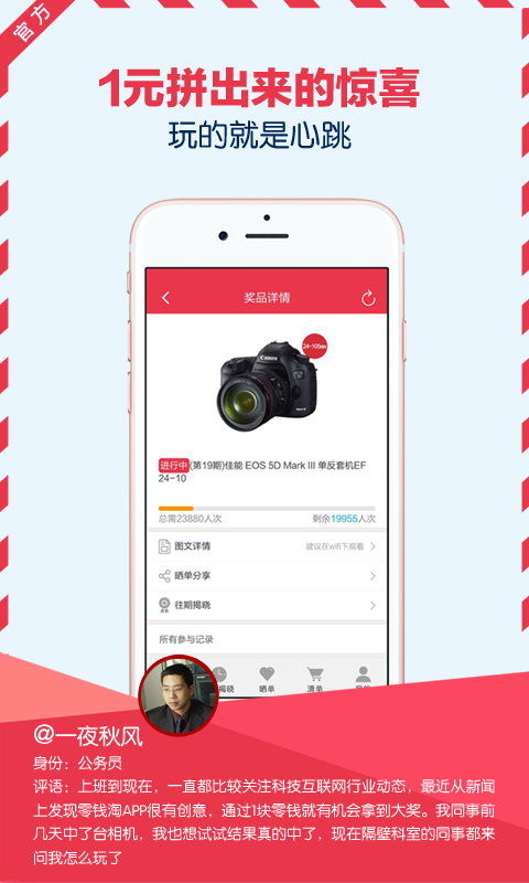 零錢(qián)淘app是一款眾籌購(gòu)物平臺(tái),在這里,用戶(hù)只需使用一塊錢(qián)即可參加眾籌購(gòu)物中,買(mǎi)到自己心心念念想要的商品,盡情享受那一元所帶來(lái)的驚喜和希望 。
