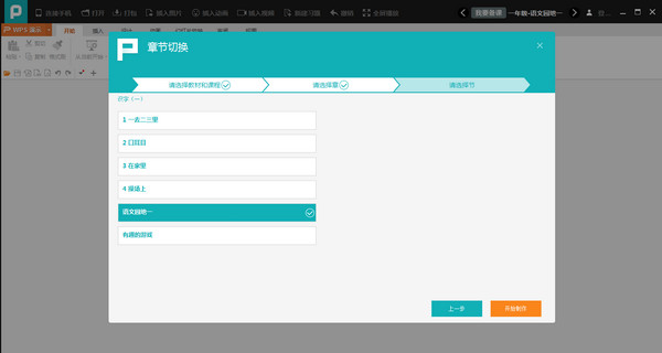 如何用101教育PPT設(shè)置課程?用戶第一次使用軟件客戶端時(shí),系統(tǒng)將會(huì)彈出課程引導(dǎo)窗口,如下圖所示,用戶需按照引導(dǎo)依次選擇授課年級(jí)、學(xué)科、教材版本、上下冊(cè)、章、節(jié)。例如:用戶依次選擇二年級(jí)-語文-人教版-上冊(cè)-第一章-找春天。選擇完成后點(diǎn)擊開始制作即可。
