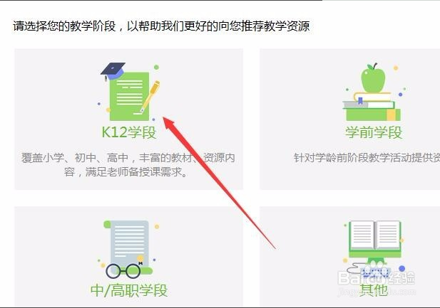 我現(xiàn)在選擇中小學(xué)學(xué)段,代號(hào)是K12,單擊相應(yīng)的圖標(biāo),進(jìn)入下一步。