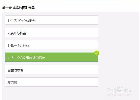 選擇章節(jié),第一章豐富的圖形世界,從三個(gè)方向看物體的形狀。這樣課程就選擇好了,單擊開始制作按鈕。