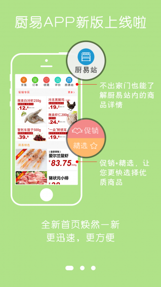 廚易時(shí)代app是上海廚易配菜有限公司推出的移動(dòng)終端,成立于2010年5月的上海廚易配菜有限公司,集采供平臺(tái)、城市生鮮物流、社區(qū)銷(xiāo)售終端于一體的全新都市生鮮食品o2o模式,科學(xué)汲取農(nóng)貿(mào)市場(chǎng)和現(xiàn)代賣(mài)場(chǎng)及電子商務(wù)的優(yōu)勢(shì),改善傳統(tǒng)生鮮食品流通和銷(xiāo)售的不足之處。廚易時(shí)代充分利用互聯(lián)網(wǎng)+手段實(shí)現(xiàn)了將生鮮食品濃縮在5㎡的社區(qū)終端,通過(guò)自主研發(fā)的“全智能售菜提貨一體機(jī)——廚易站”直接銷(xiāo)售給居民,真正將菜場(chǎng)和超市搬進(jìn)社區(qū)。為消費(fèi)者提供*實(shí)惠便捷的包括一日三餐所需的所有食材,也為城市居民提供了*有效的新“菜籃子”解決方案,提升人們的生活品質(zhì)。