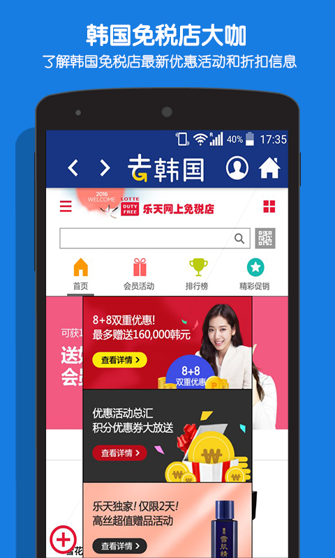 通過去韓國(guó)APP,您可以了解到免稅店的優(yōu)惠活動(dòng)和折扣信息等,并直接在韓國(guó)免稅店網(wǎng)上購(gòu)物。