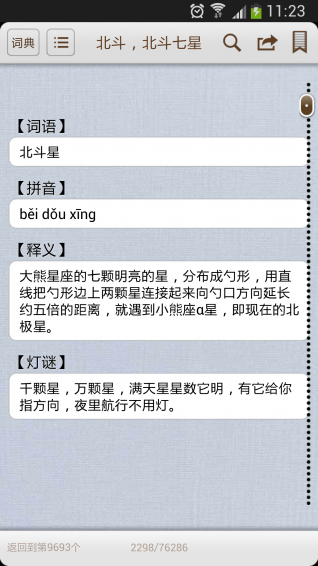 漢語詞庫(kù)手機(jī)版app,內(nèi)容詳細(xì),排版精美,使用方便。一、收錄76,000多個(gè)詞語,包含讀音、英文解釋、中文解釋及例句;