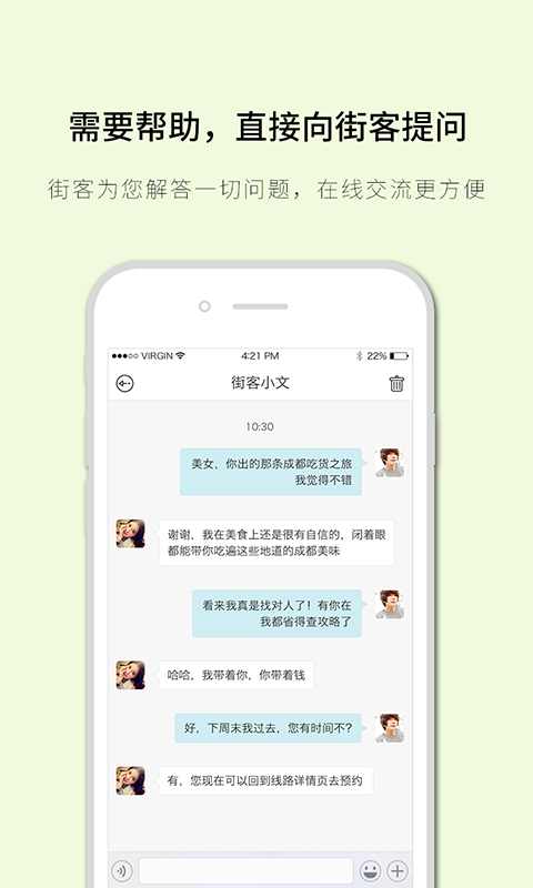 街客能帶給您,旅行中的當(dāng)?shù)厝藷崆?,友情,激情,讓你的旅行因街客而精彩?br />街客能帶給您,私人訂制式時(shí)尚旅行社交,豐富優(yōu)質(zhì)的線路,讓你的生活妙不可言!