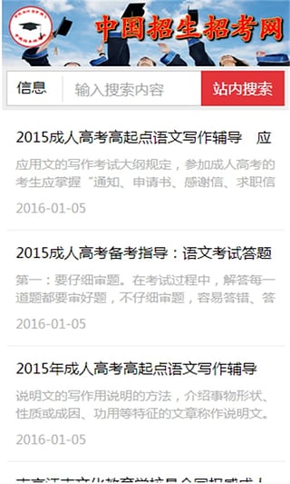 △成人高考:是中國(guó)招生考試網(wǎng)2003開始建設(shè)的新頻道,開設(shè)有成考資訊、成考政策、成考專業(yè)、成考分?jǐn)?shù)、報(bào)考指南等欄目,是參加成人高考考生的有效成考資訊獲取途徑。