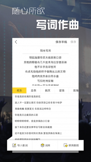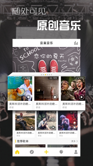 喜歡聽(tīng)歌? 我們建議你下載“酷我音樂(lè)”、“QQ音樂(lè)”、“蝦米音樂(lè)” 喜歡唱歌? 我們建議你下載全民K歌、酷我K歌 想寫(xiě)詞作曲,擁有一首屬于自己的歌? 嗨,朋友,那就來(lái)“音巢”玩吧! 我們厭倦了 聽(tīng)別人的歌 我們厭倦了 唱?jiǎng)e人的歌 我們渴望用原創(chuàng)音樂(lè)表達(dá)真實(shí)的自我 在這里 無(wú)需懂樂(lè)器 無(wú)需知樂(lè)理 只要你想! 零基礎(chǔ)寫(xiě)詞作曲也能so easy! 普通人也能擁有屬于自己的歌! 音巢:為音樂(lè)夢(mèng)想而生 人人都是作曲家